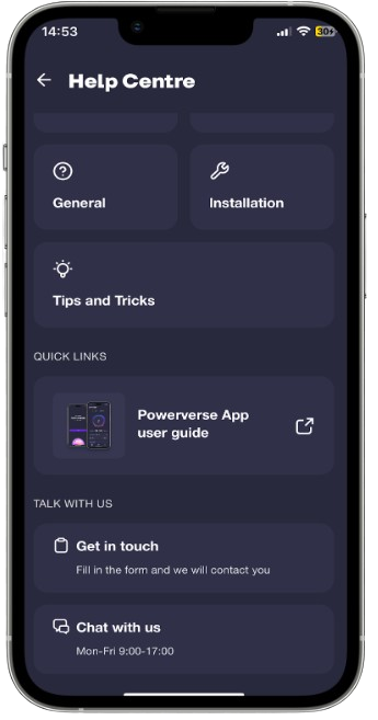 You can find the Chat with us page by navigating to the [Account] section of the app and tapping [Help Centre]. Alternatively, you can raise a support ticket by tapping [Get in touch].