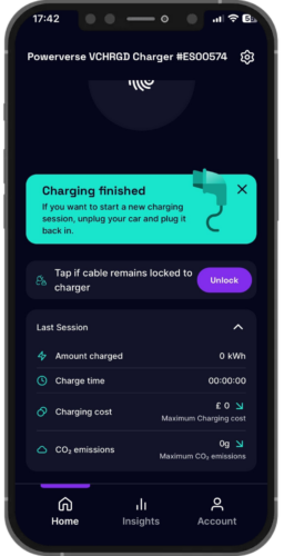 If you’ve got solar panels, you’ll notice a ‘maximum’ flag beside the cost and CO2 statistics in the Insights section of the app. Solar panels reduce the cost and CO2 emissions of your energy, meaning that the true cost of your charging and CO2 emissions may be lower than the amounts shown.