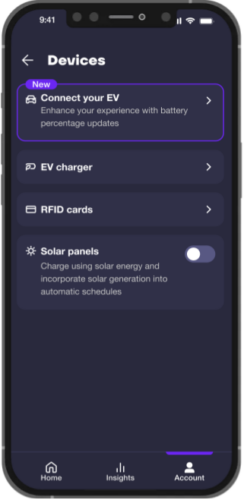 Compatible EVs can now connect to the app. By connecting your EV, you can receive EV battery percentage and range updates, helping you plan your charging ahead of time. This feature is powered by Enode.