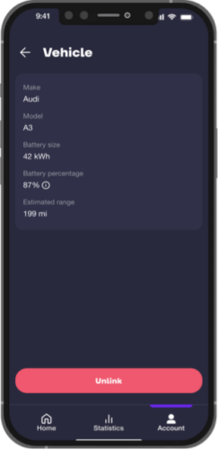 Navigate to the [Account] section of the app and tap [Devices]. Here, you’ll see the option to connect your EV via Enode. Continue through the stages and select your brand and vehicle name to connect. You’ll need to give us permission to access your vehicle data and log into your vehicle account to complete the connection. Once you’ve connected, you’ll be able to view your EV’s battery percentage and estimated range in the app home screen. When you’re charging, you’ll see regular updates to your battery percentage and range.